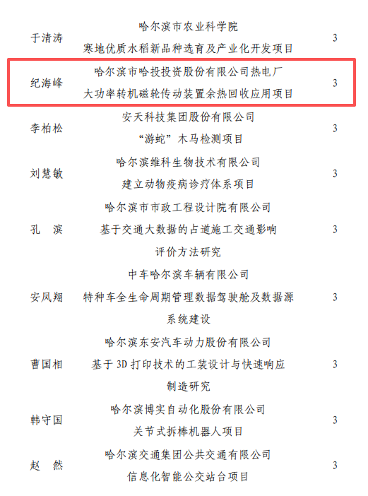 近日,哈尔滨市总工会发布通报,按照《关于推荐申报 2025年职工创新补助资金项目的通知》要求,经基层工会推荐、专家评审、会议审议、哈工网公示,市总工会对哈尔滨市哈投投资股份有限公司热电厂大功率转机磁轮传动装置余热回收应用项目给予资金补助。